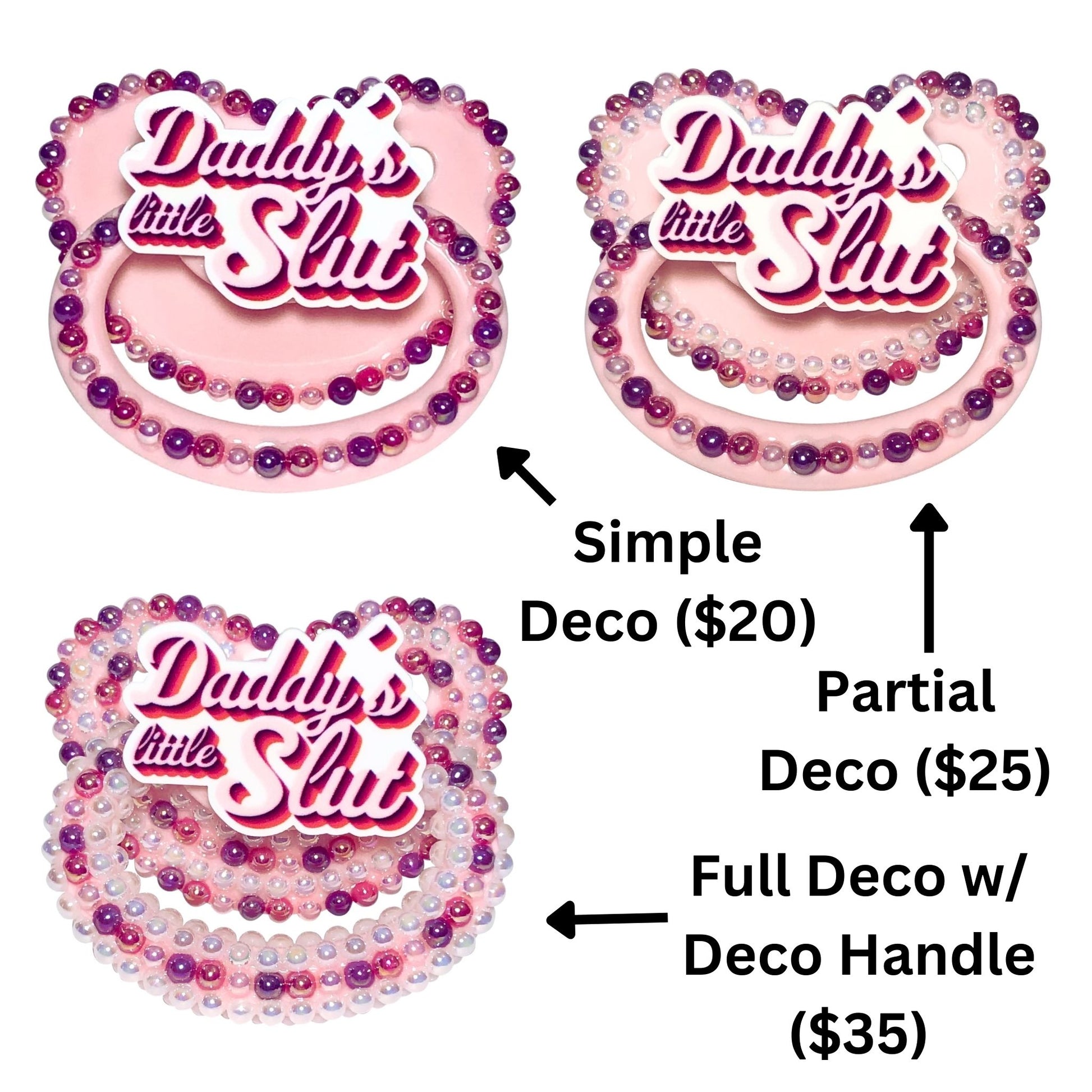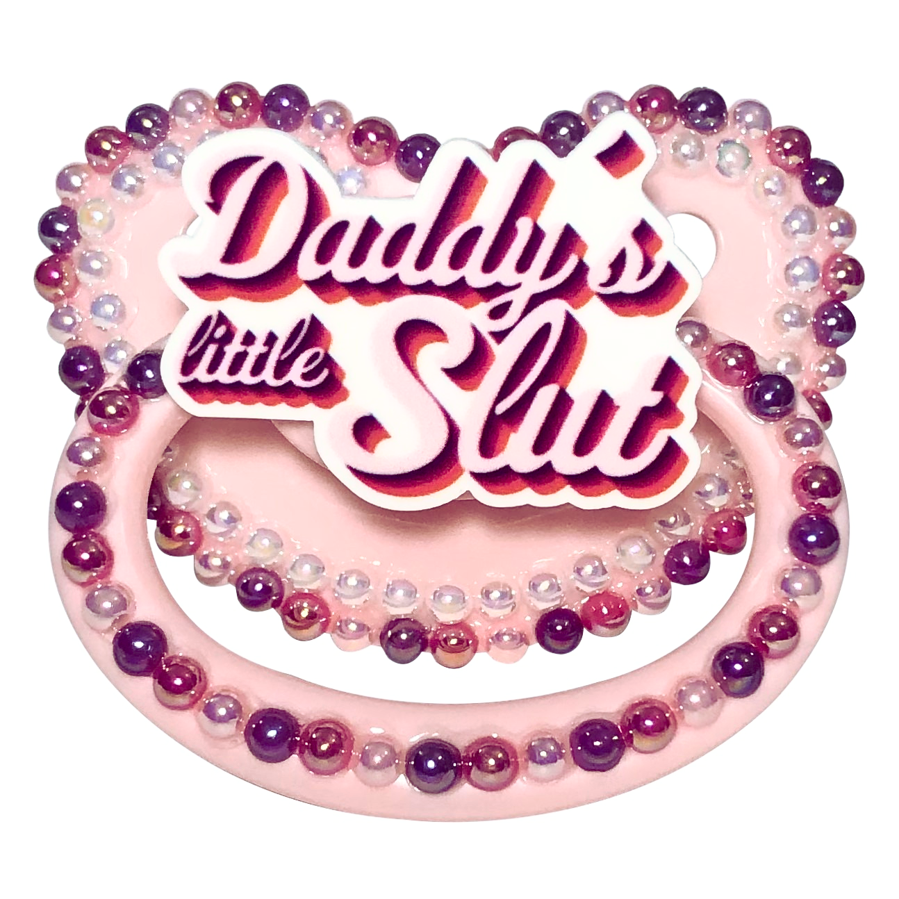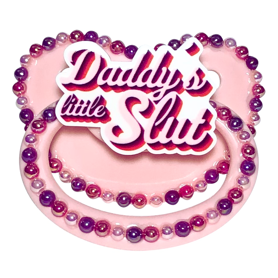 Adult Pacifier Baby Bear Pacis "Daddy's Little Slut" Pink Adult Pacifier, Light Pink, Dark Pink, Plum Purple, and White Flatback AB Pearls, (DDLG, ABDL, Age Regression, Little Space)