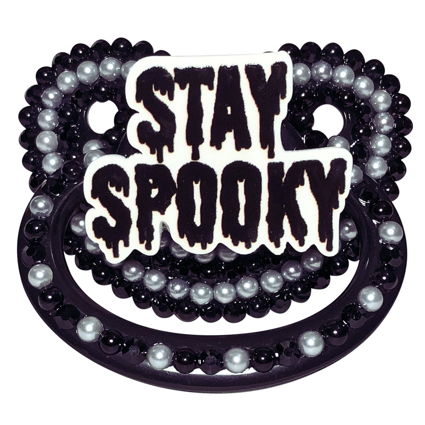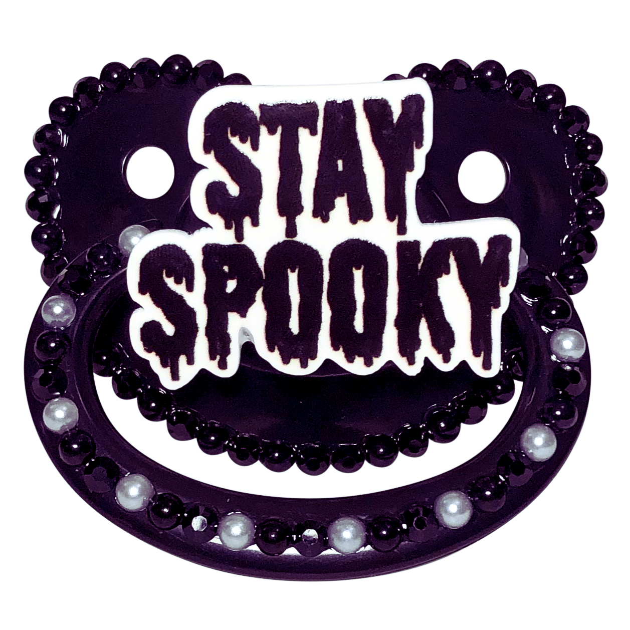 Adult Pacifier Baby Bear Pacis "Stay Spooky" Black Adult Pacifier, Black and White Flatback Pearls, Black Rhinestones (DDLG, ABDL, Age Regression, Little Space)