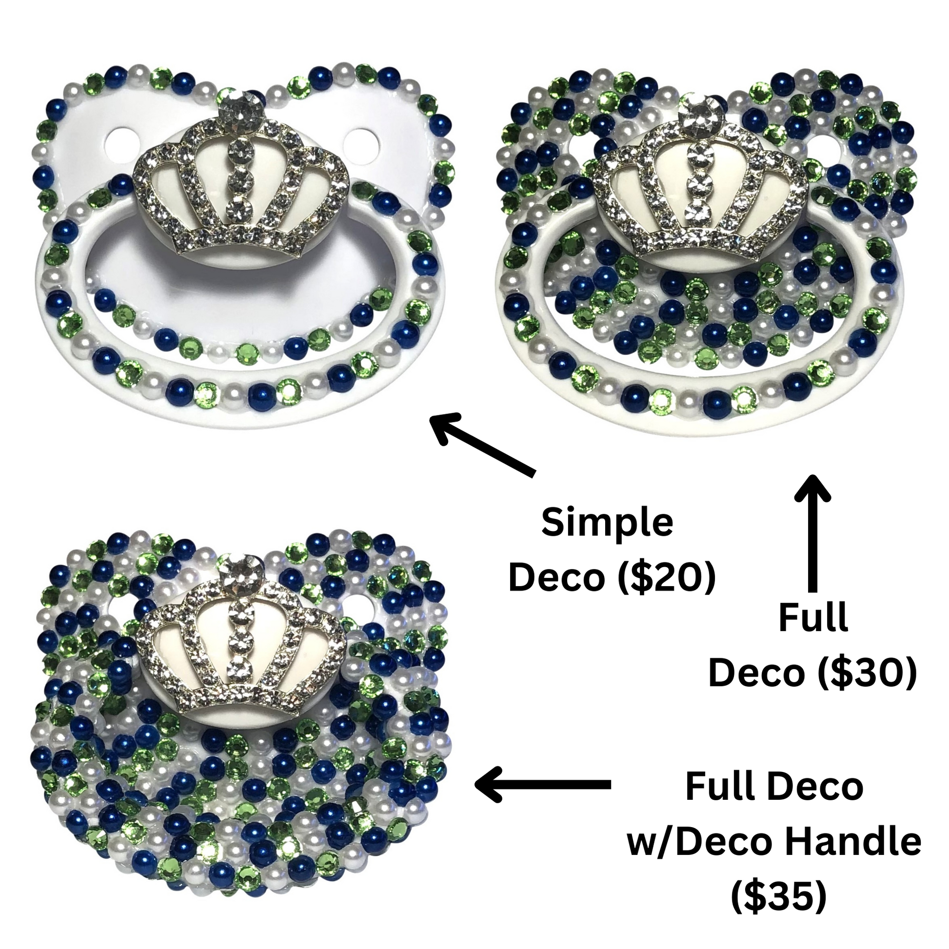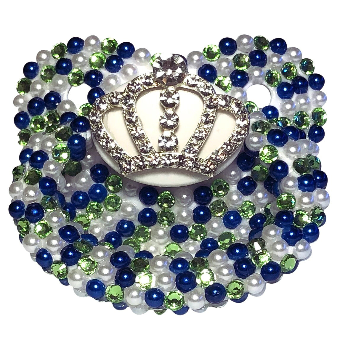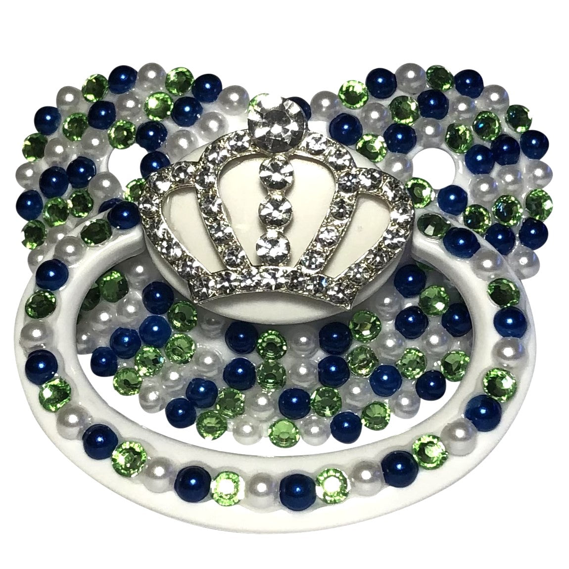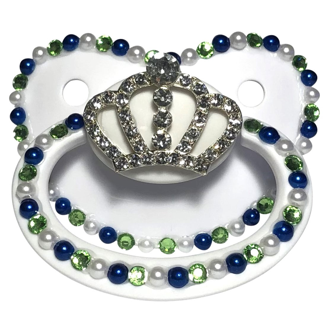 Adult Pacifier Baby Bear Pacis White, Blue, and Green Crown Adult Pacifier, White, Blue, and Green Flatback Pearls, (DDLG, ABDL, Age Regression, Little Space)