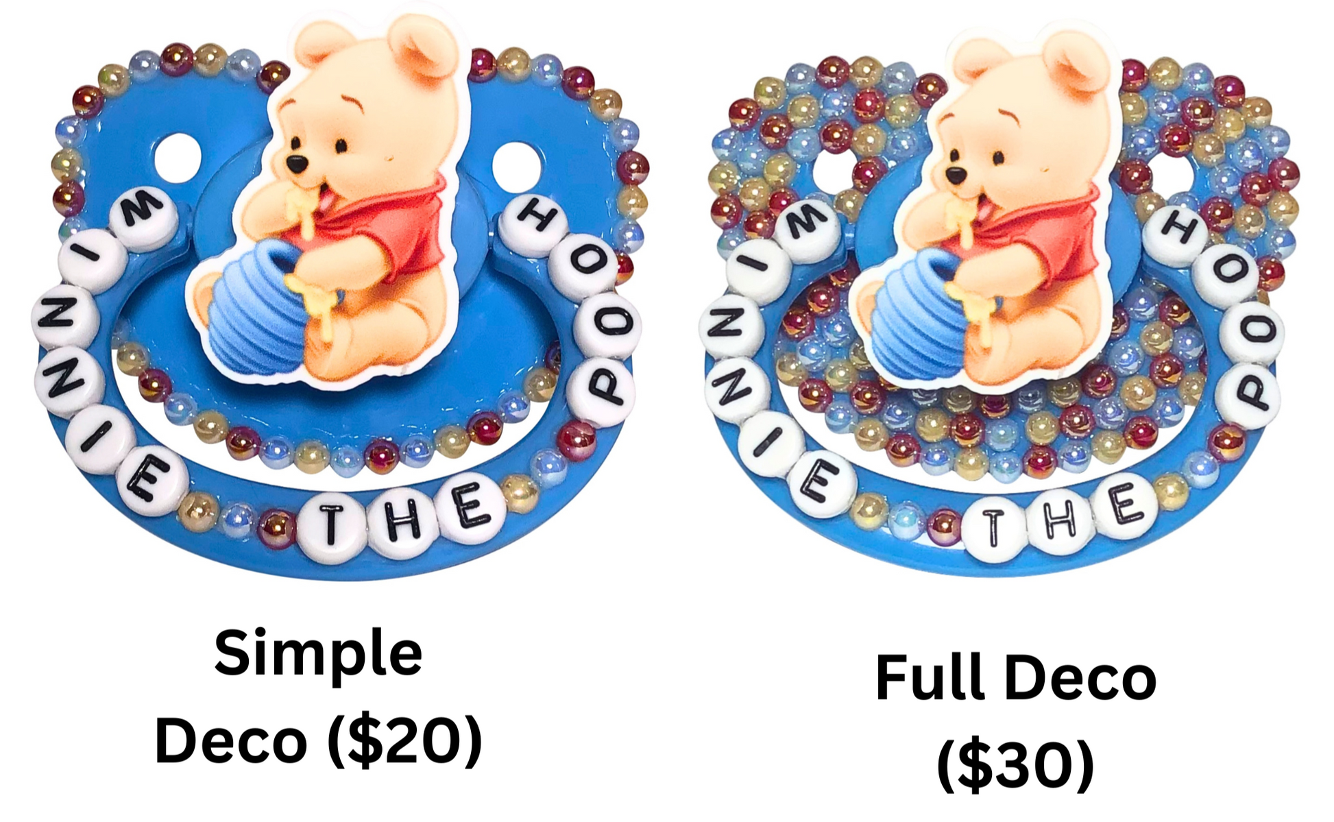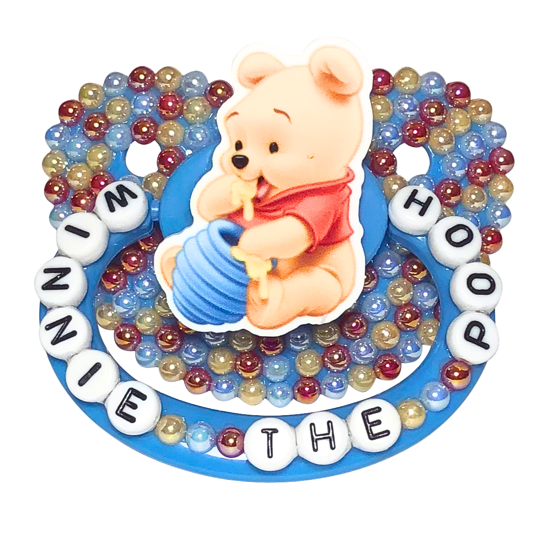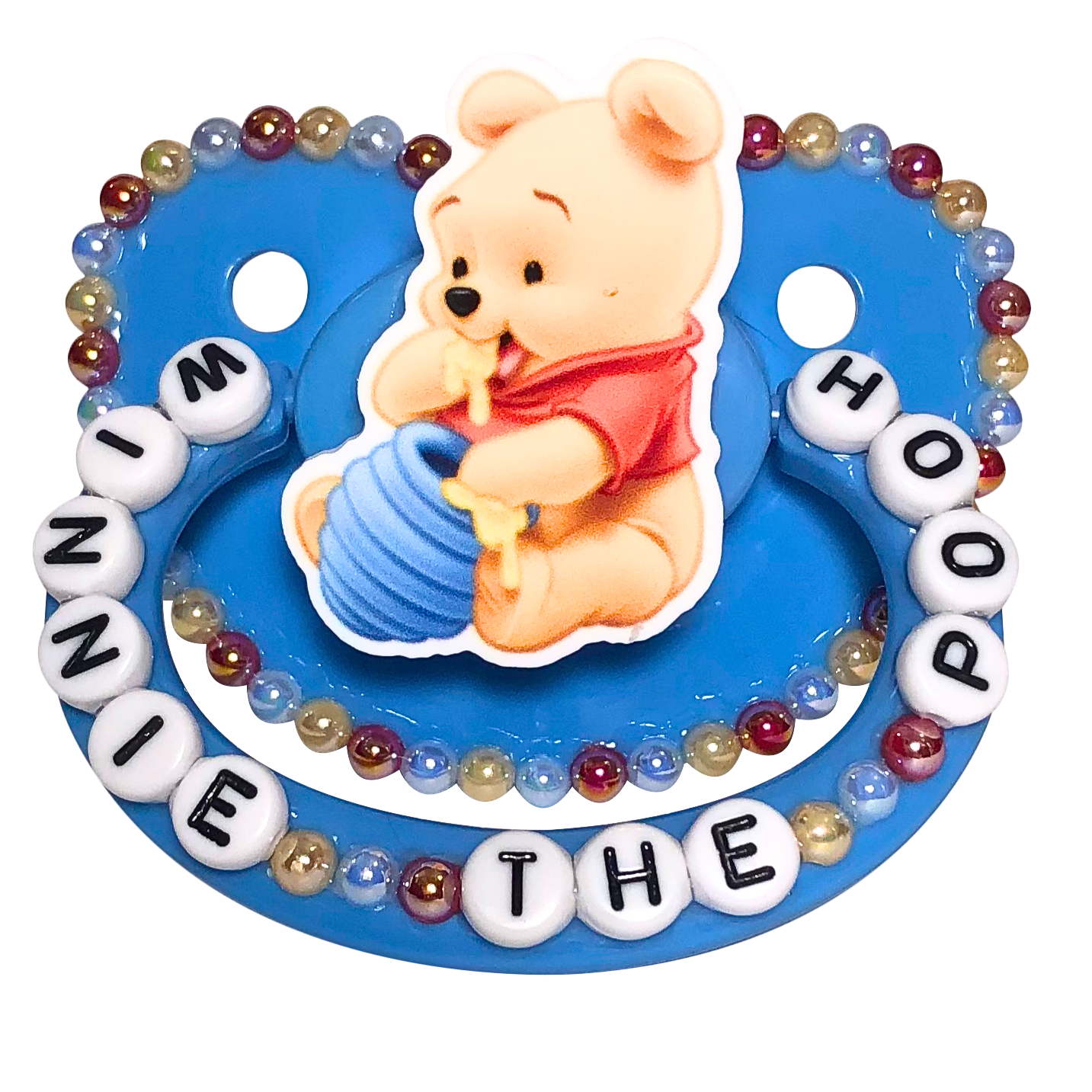 Adult Pacifier Baby Bear Pacis "Winnie the Pooh" Blue Adult Pacifier, Blue, Red, and Orange Flatback Pearls (DDLG, ABDL, Age Regression, Little Space)