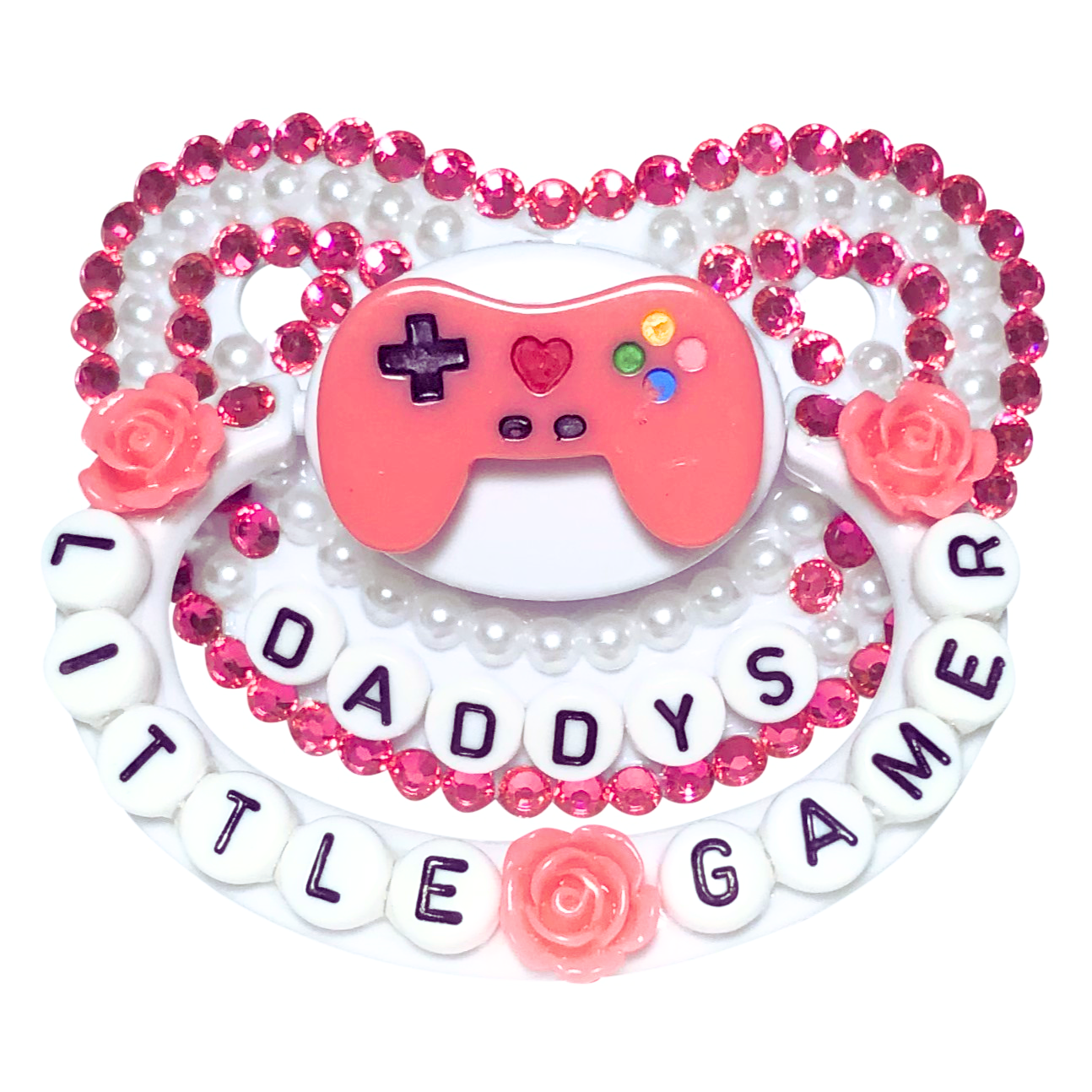 Adult Pacifier Baby Bear Pacis "Daddy's Little Gamer" White Adult Pacifier, White Flatback Pearls, Dark Pink Rhinestones (DDLG, ABDL, Age Regression, Little Space)