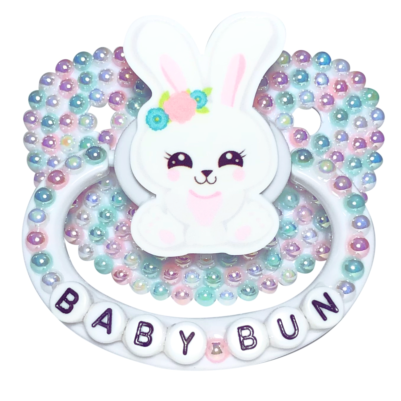 Adult Pacifier Baby Bear Pacis "Baby Bun" Blue Adult Pacifier, Blue-Green, Pink, and White Flatback AB Pearls, (DDLG, ABDL, Age Regression, Little Space)