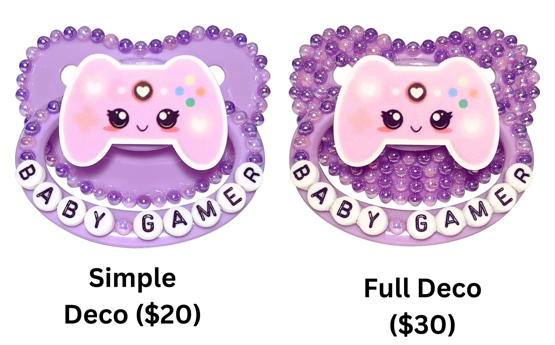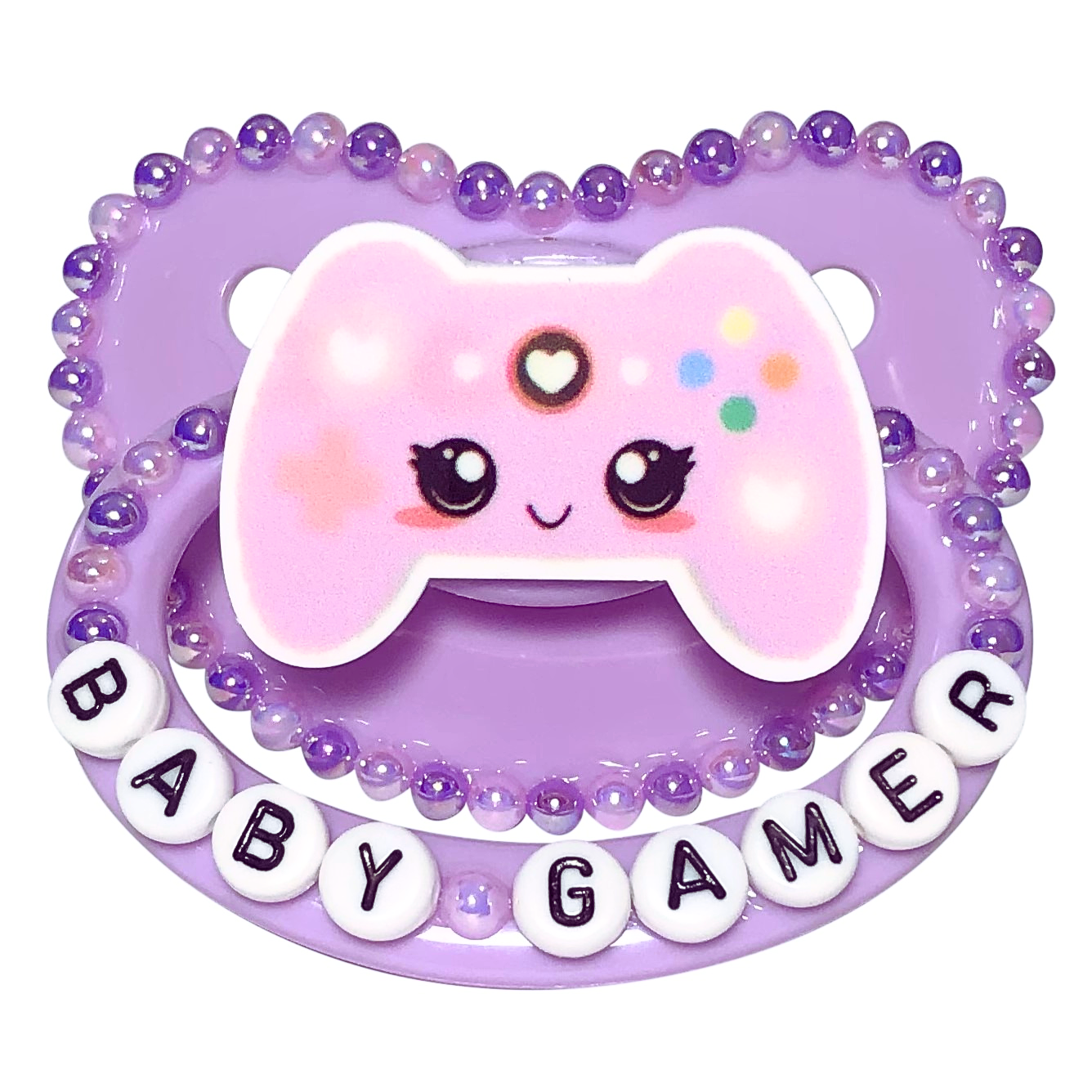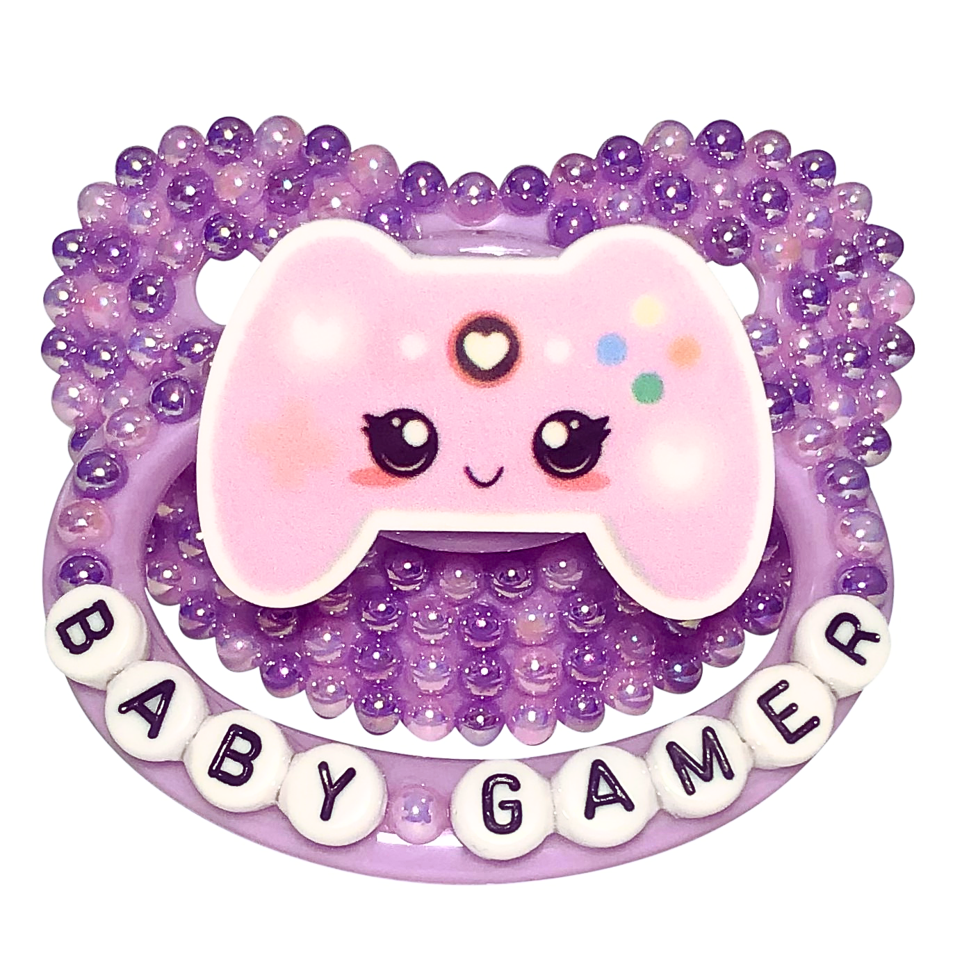 Adult Pacifier Baby Bear Pacis "Baby Gamer" Purple Adult Pacifier, Purple Flatback AB Pearls, (DDLG, ABDL, Age Regression, Little Space)