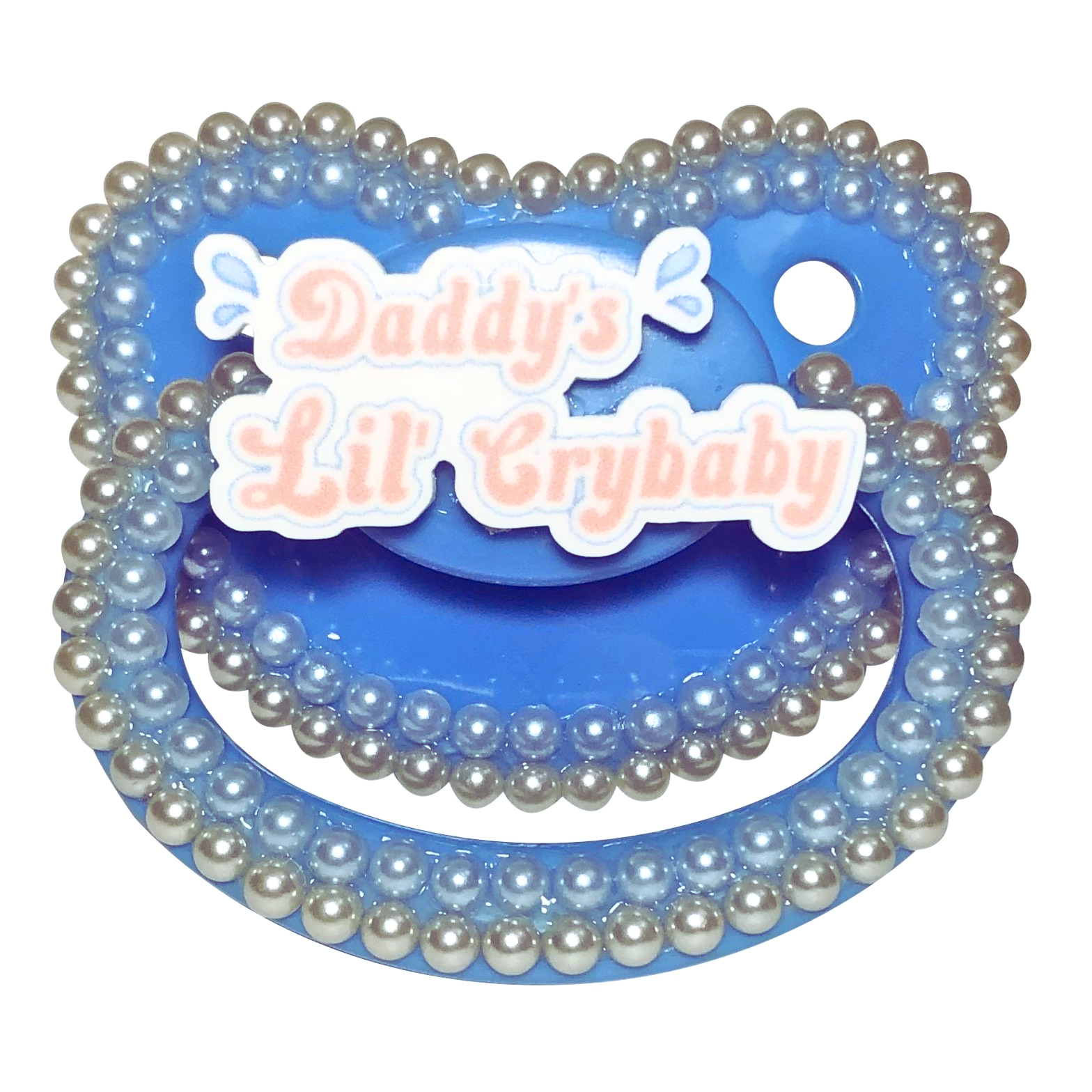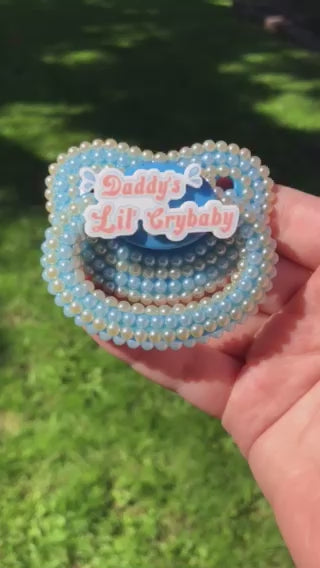 Adult Pacifier Baby Bear Pacis "Daddy;s Lil Crybaby" Blue Adult Pacifier, Orange and Pale Blue Flatback Pearls, (DDLG, ABDL, Age Regression, Little Space)