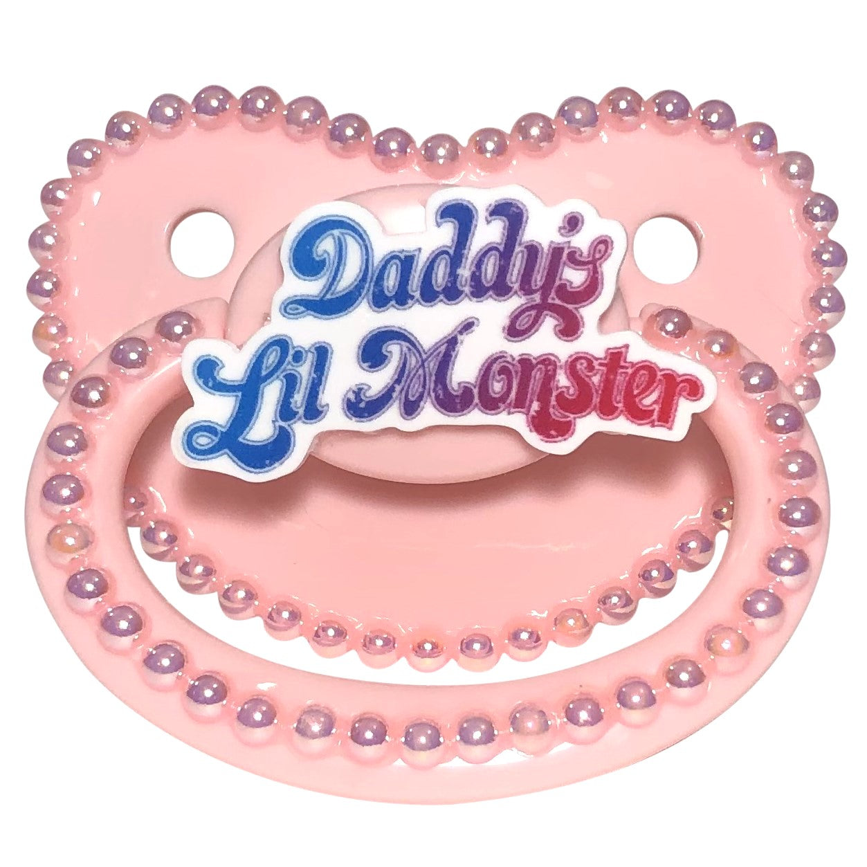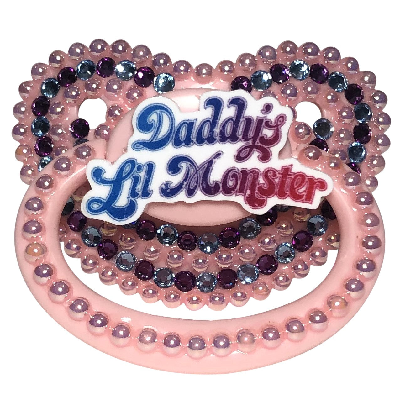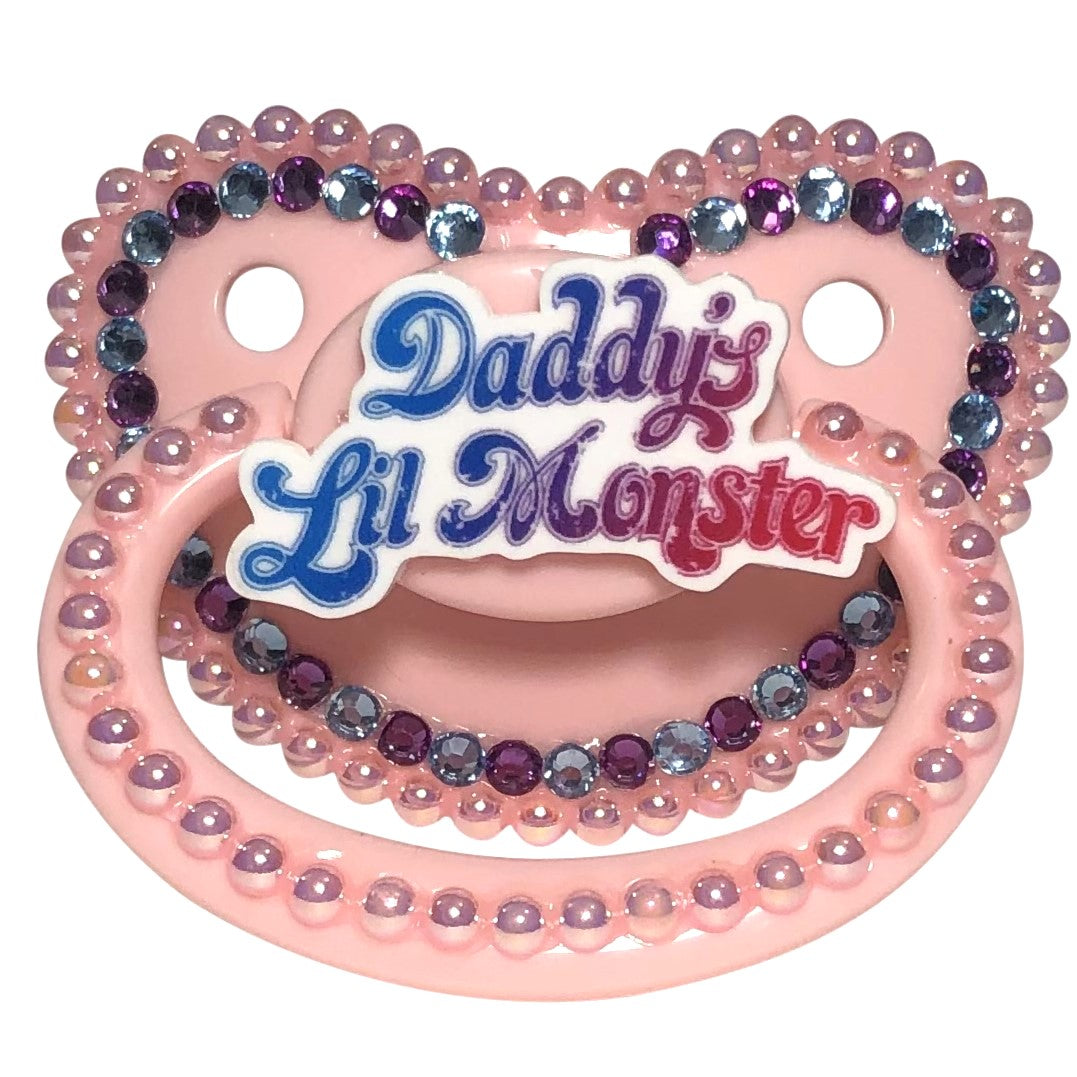 Adult Pacifier Baby Bear Pacis "Daddy's Lil Monster" Pink Adult Pacifier, Pink Flatback Pearls, Blue and Purple Rhinestones (DDLG, ABDL, Age Regression, Little Space)
