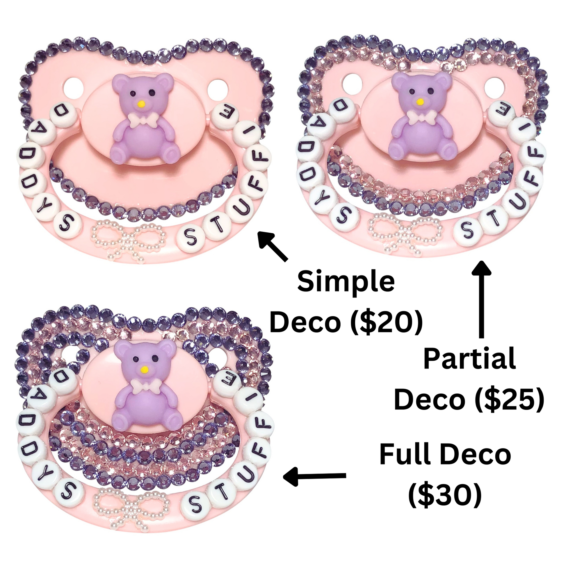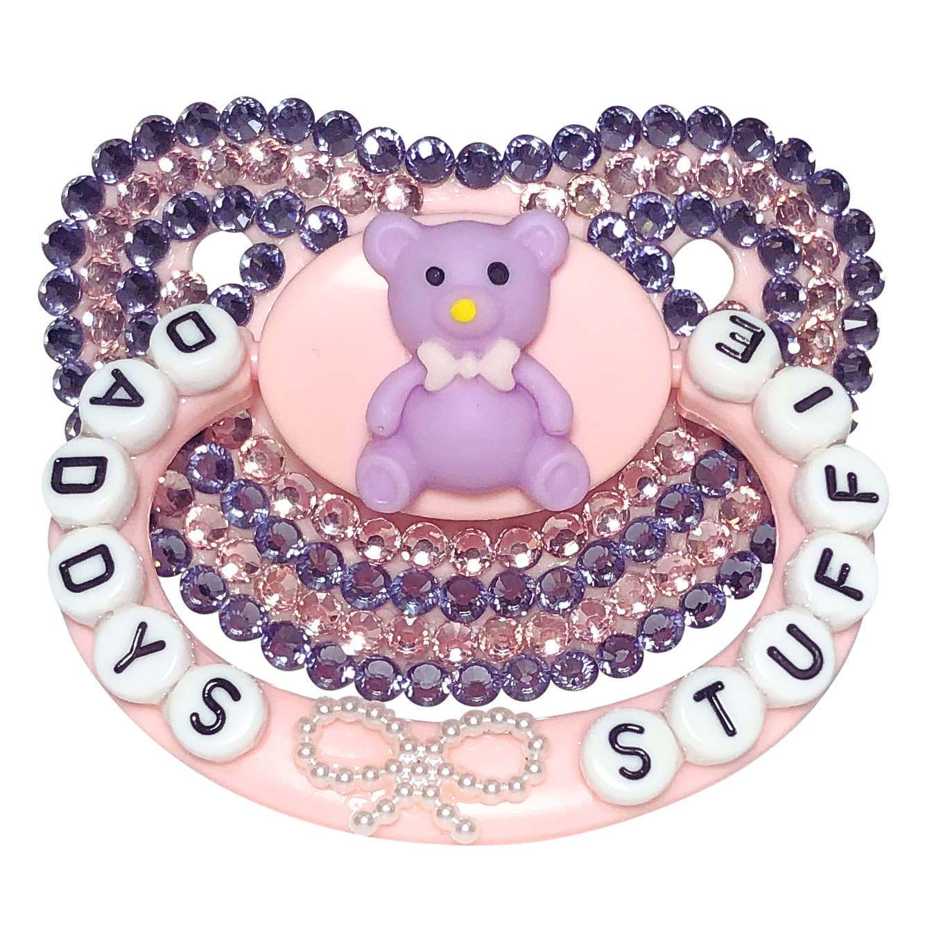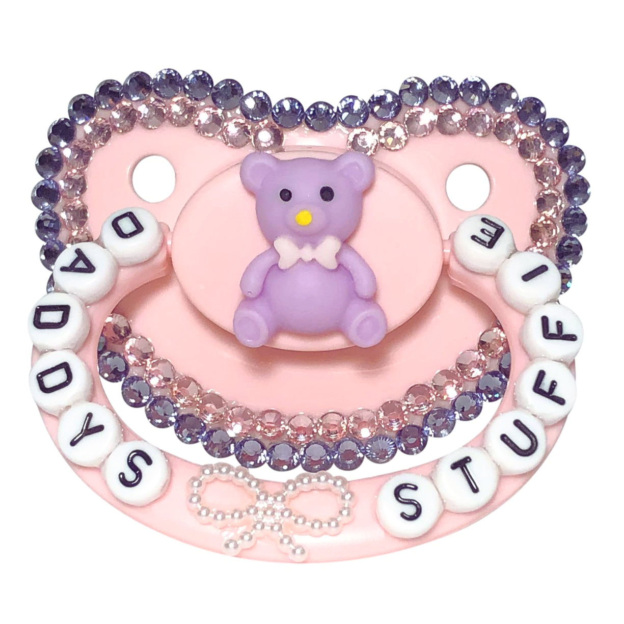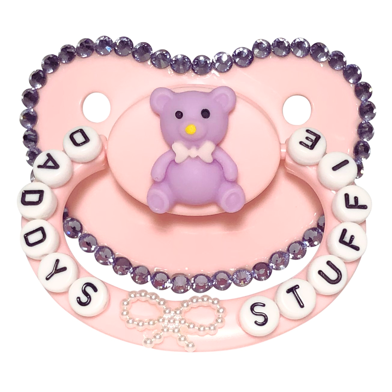 Adult Pacifier Baby Bear Pacis "Daddy's Stuffie" Pink Teddy Bear Adult Pacifier, Purple and Pink Flatback Pearls (DDLG, ABDL, Age Regression, Little Space)