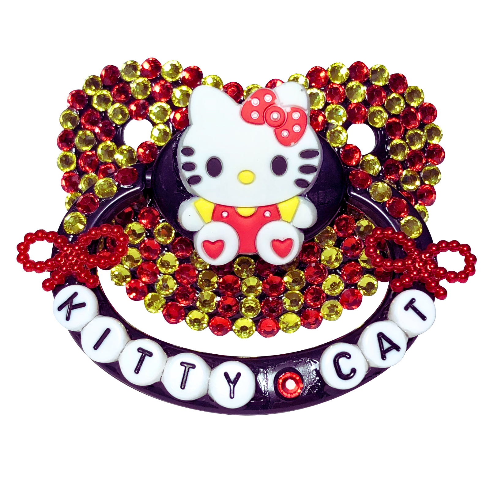 Adult Pacifier Baby Bear Pacis "Kitty Cat" Black Hello Kitty Adult Pacifier, Red and Yellow Flatback Rhinestones, (DDLG, ABDL, Age Regression, Little Space)