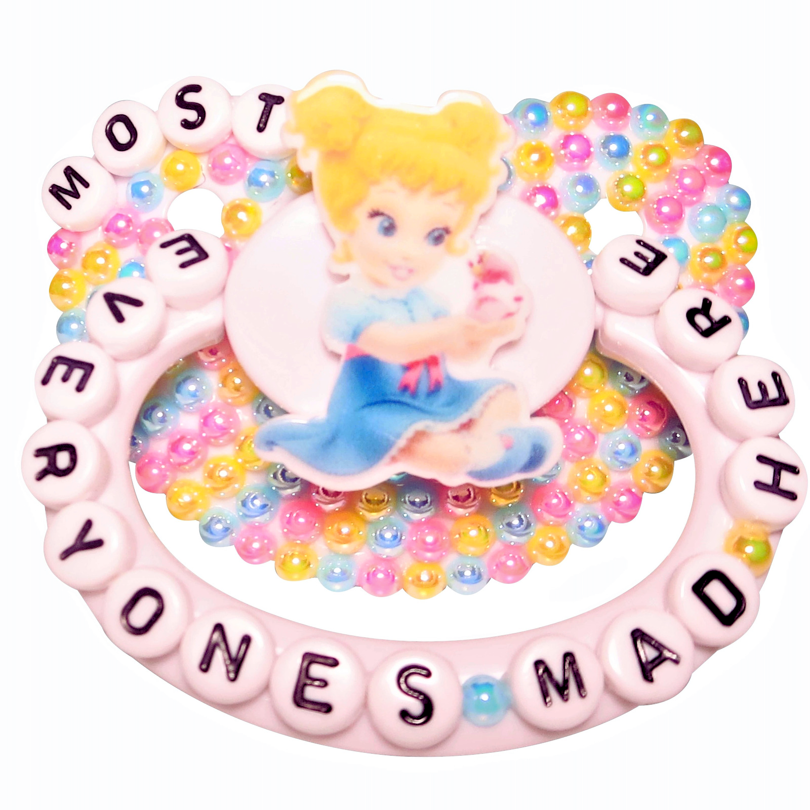 Adult Pacifier Baby Bear Pacis "Most Everyone's Mad Here" White Alice In Wonderland Adult Pacifier, Blue, Pink, Yellow Flatback Pearls, Baby Alice Resin Centerpiece (DDLG, ABDL, Age Regression, Little Space)